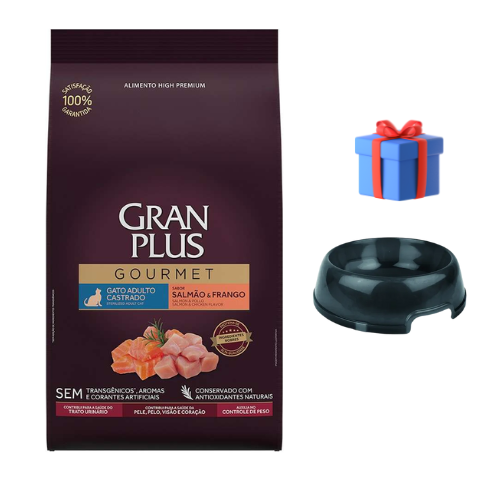 GRAN PLUS para gatos Castrados Pollo y Salmón10kg + Plato